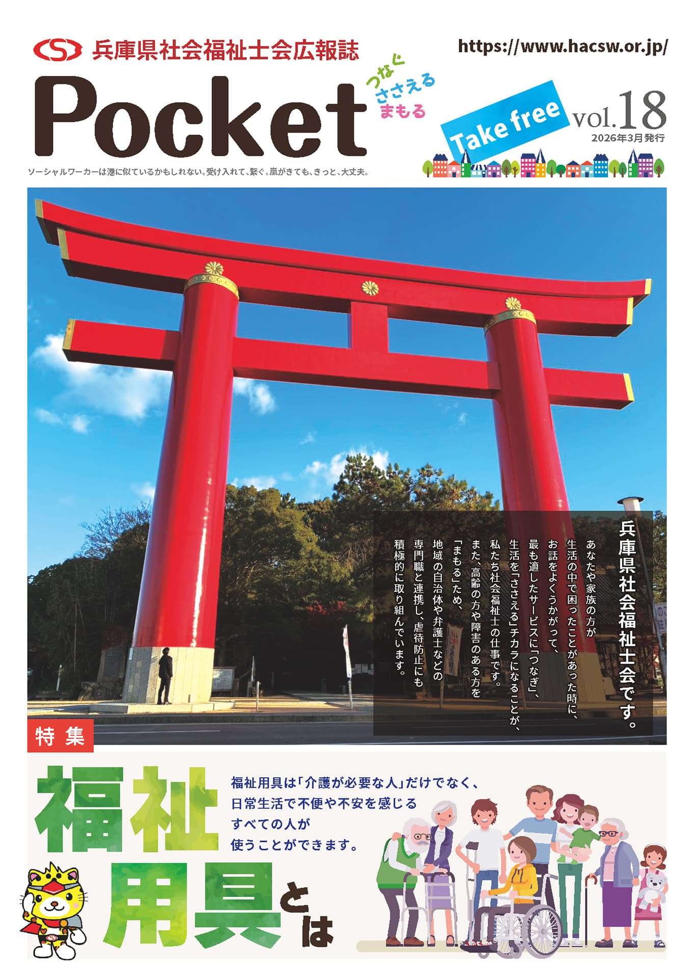 兵庫県民に社会福祉士や兵庫県社会福祉士会のことをより知ってもらうために、広報誌「pocket」を発行しています。各ブロックの会員が関係機関に赴き、配布いたします。社会福祉士と関係機関の顔つなぎも目的としています。