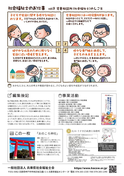 兵庫県社会福祉士会が定期的(年4回)に発行している会員機関誌です。兵庫県社会福祉士会が設立20周年を迎えるにあたって、これまで「ひよこ通信」としていた名称を2013年夏号発行分より、「こうのとり通信」へと変更いたしました。研修やイベントの報告、委員会・ブロックの活動報告などを掲載しています。